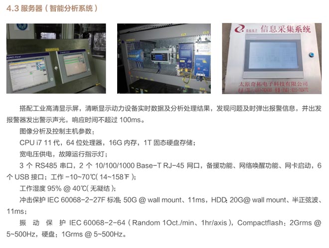動力設備集群智能在線監(jiān)測管理系統(tǒng)集成于狀態(tài)監(jiān)測設備上,可通過設備自帶的網絡接口訪問的基于 Web服務的軟件,用于狀態(tài)監(jiān)測任務的配置,實時監(jiān)測數據的分析和查看。安裝于服務器上器上的設備組態(tài)軟件,用于對監(jiān)測對象進行組態(tài),實時顯示設備群組、單獨設備、單獨測點的監(jiān)測狀態(tài),進行可視化狀態(tài)檢測及設備狀態(tài)的在線可視化。